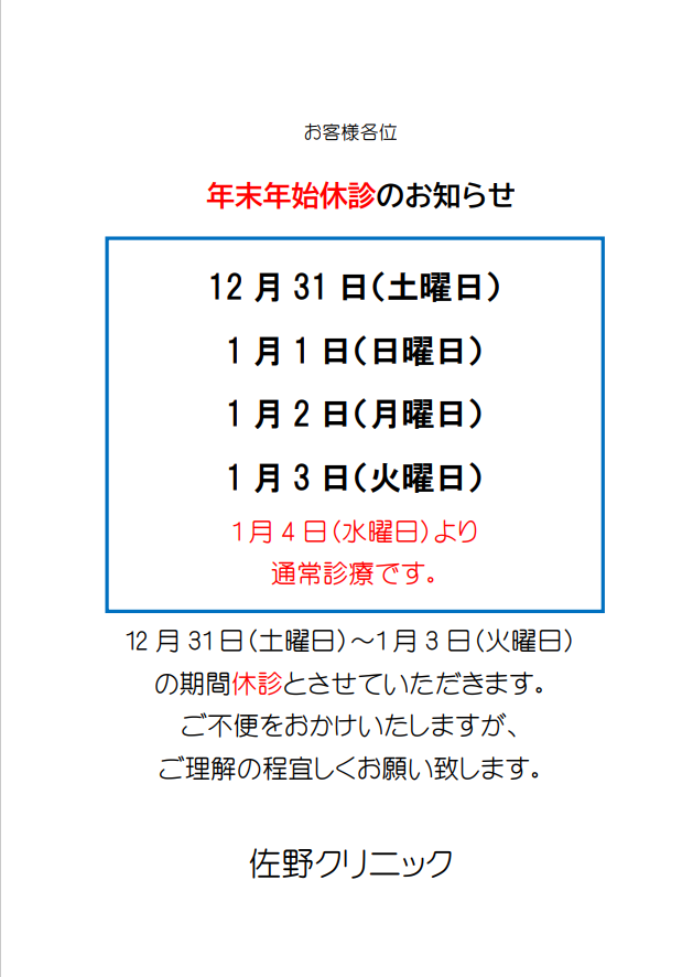 下記日程で年末年始は休診させていただきます。
